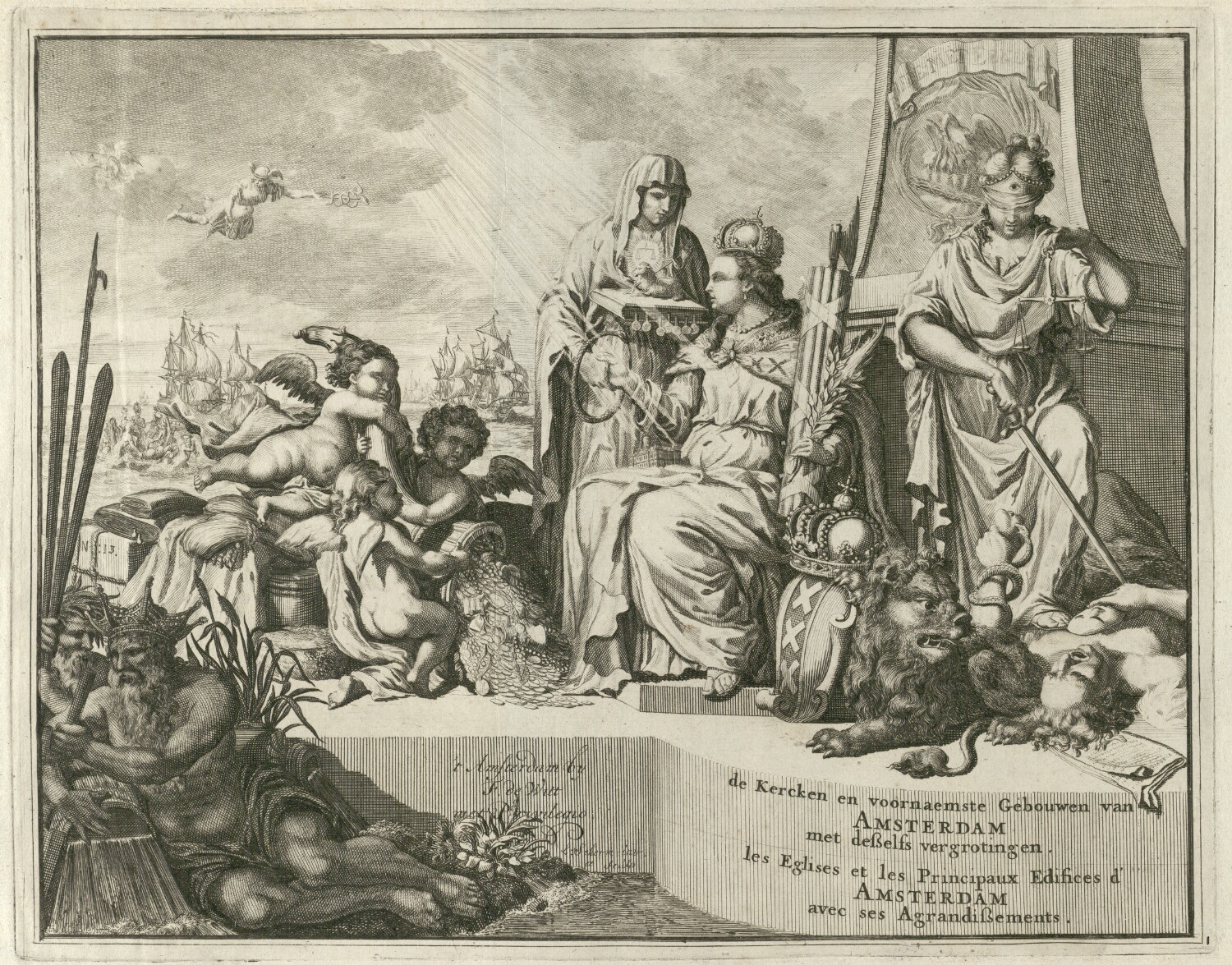 Les Eglises et les Principaux Edifices d'Amsterdam avec des Agrandißements De Kecken en voornaemste Gebouwen van Amsterdam met deßelfs vergrotingen / L. Schern inv. |
