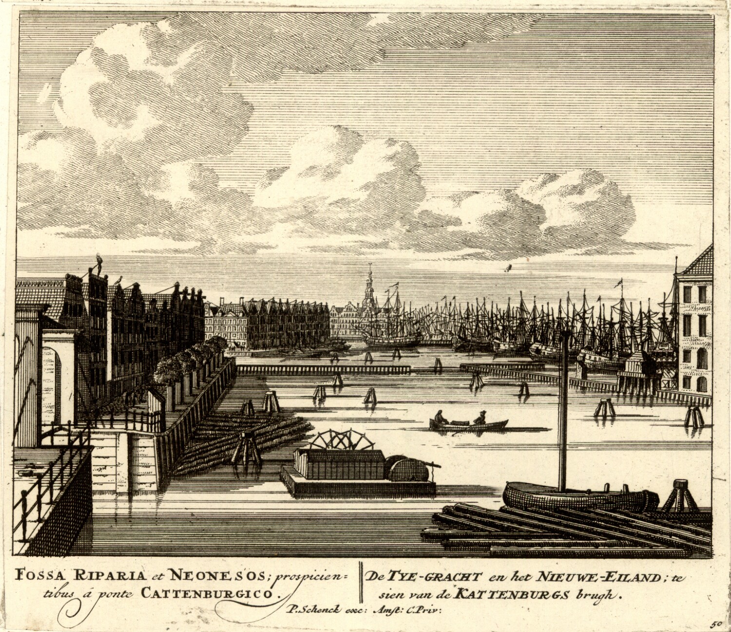 [Afbeeldinge der voornaamste Gebouwen van Amsterdam] P. Schenck exc 50, Fossa Riparia et Neonesos; prospicientibus á ponte Cattenburgico = De Tye-Gracht en het Nieuwe-Eiland; te sien van de Kattenburgs brugh / |