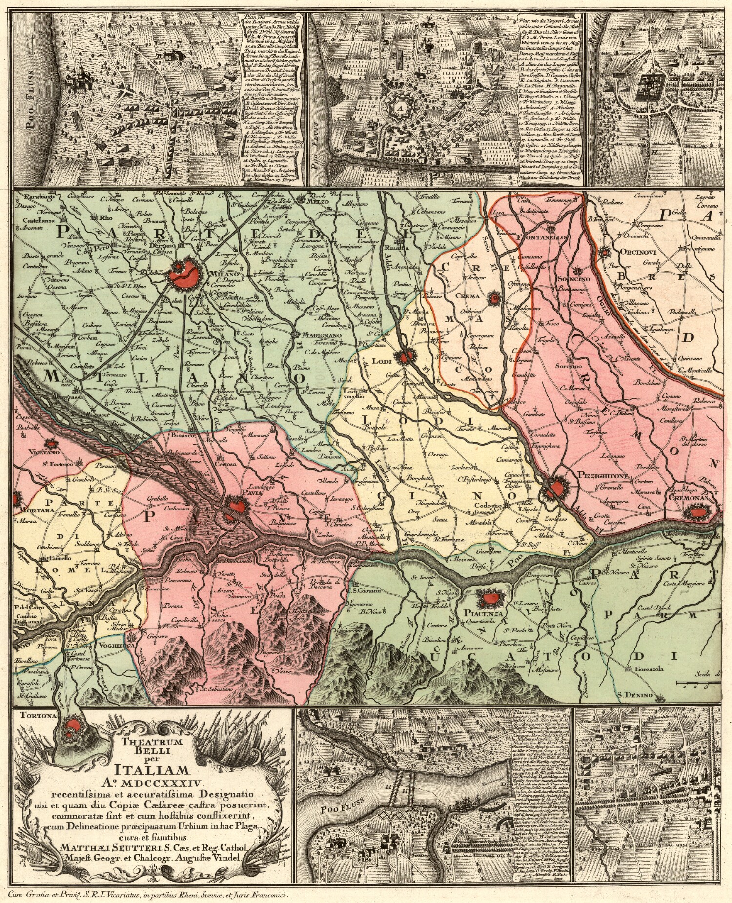 Theatrum Belli per Italiam Ao. MDCCXXXIV recentissima et accuratissima Designatio ubi et quam diu Copiae Caesareae castra posuerint, commoratae sint et cum hostibus conflixerint, cum Delineatione praecipuarum Urbium in hac Plaga cura et sumtibus / Matthaei Seutteri, S. Caes. et Reg. Cathol. Majest. Geogr. et Chalcogr. Augustae Vindel. |