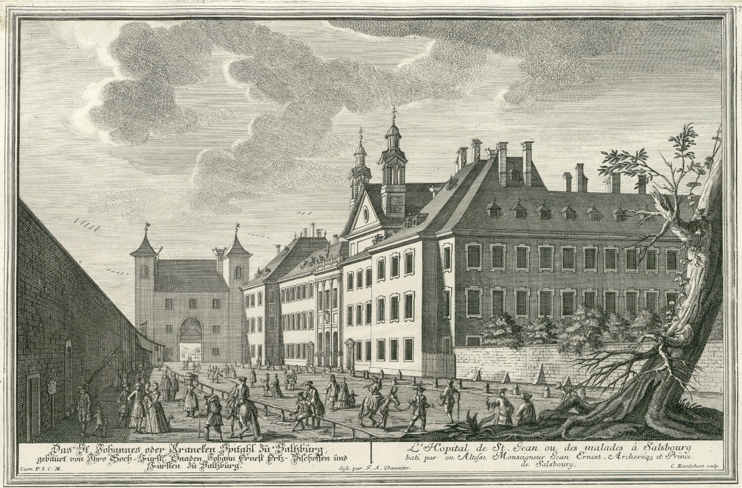 [Die Saltzburgische Kirchenprospect gezeichnet und unterthänigst überreichet]. [Dem Hochwürdigsten, Hochgebohrnen, des H. R. R. Fürsten, und Herrn Herrn Leopoldo, Ertz-Bischoffen zu Saltzburg Legaten des H. Römischen Apost. Stuhls zu Rom, Primati von Teutschland, auß dem Uralt Hoch-Freyherrlichen Geschlechte von Firmian &c. von Dero unterthänigst-gehorsambsten Garten Inspectore, und Cammerdiener Franc Anton Danreiter. Verlegt und an Tag gegeben durch Johann Andreas Pfeffel der Kays. Maj. Hoff-Kupferstechern in Augsburg. = Les Prospects des Eglises de Salsbourg, dess. et dediés à Son Altesse Monseigneur Leopold etc. etc. Archevéq. et Prince de Salsb: par son tres humble et tres obeisant des jardins et valet Chambre Francois Antoine Danreiter] ; dess. par F. A. Danreiter ; C. Rembshart sculp. 7, Das St. Johannes, oder Krancken Spitahl zu Saltzburg, gebauet von Ihro Hoch- Fürst. Gnaden Johann Ernest Ertz-Bischoffen und Fürsten zu Saltzburg = L'Hopital de St. Jean ou des malades à Salsbourg bati par on Altesse Monseigneur Jean Ernest. Archevéq. et Prince de Salsbourg / |