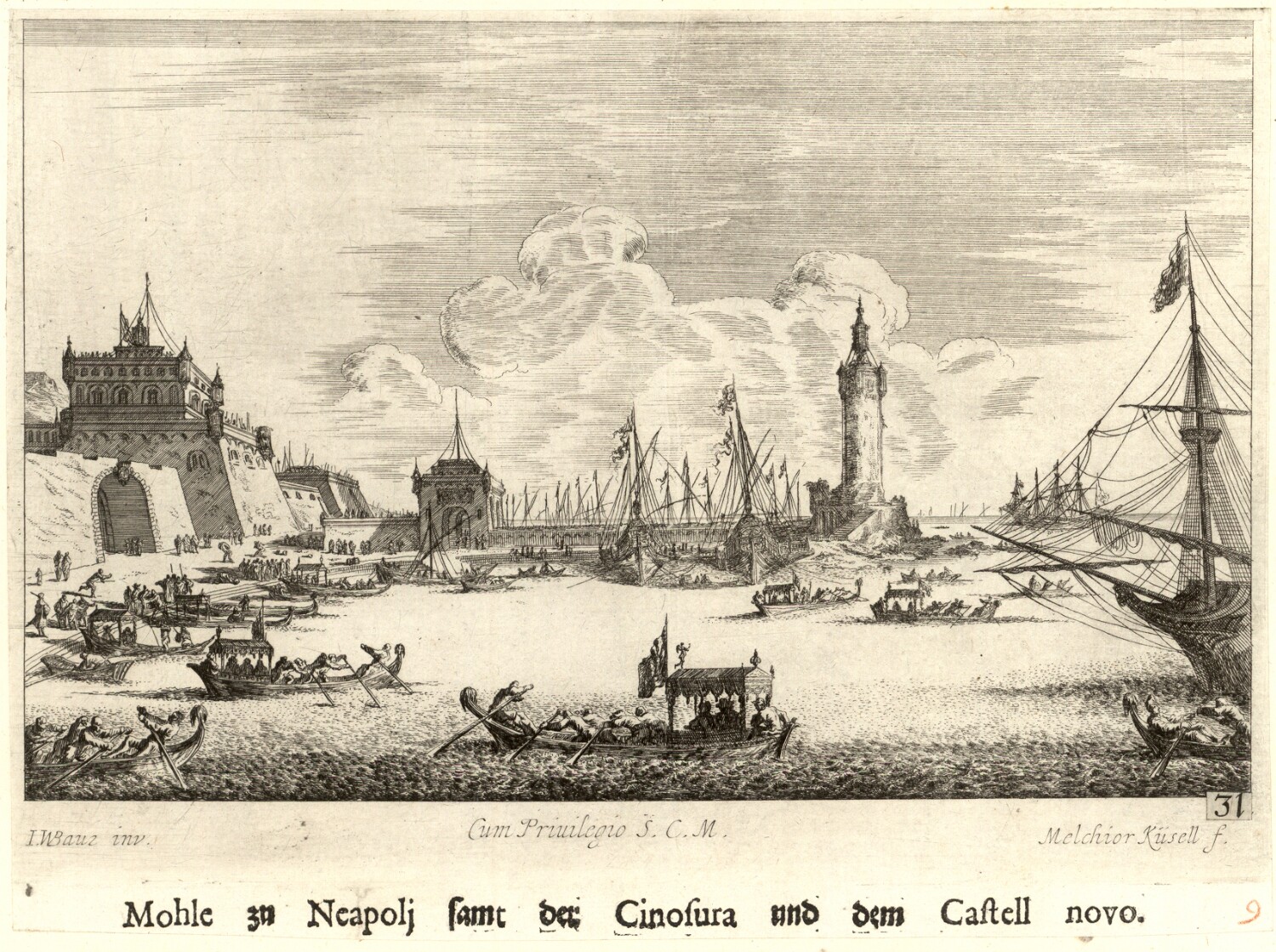 Mohle zu Neapolj samt der Cinosura und dem Castell novo I. W. Baur inv. Cum Privilegio S. C. M. Melchior Küsell f. 31 / |
